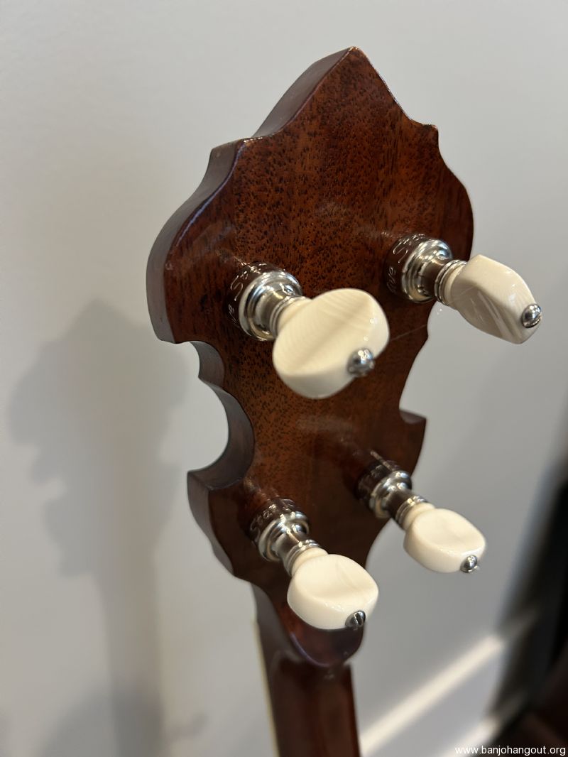 This fine lightweight woodie was custom made by Chris Sorenson several years ago. I am the original owner. The banjo is pristine, not a mark on it, except for some light smudging on the head where my pinky and ring finger are planted during playing. No dings, dents, buckle rash or scuffs on the wood, and the metal looks new. The neck has MOP inlay, Hearts & Flowers style. Also features a radiused fretboard.