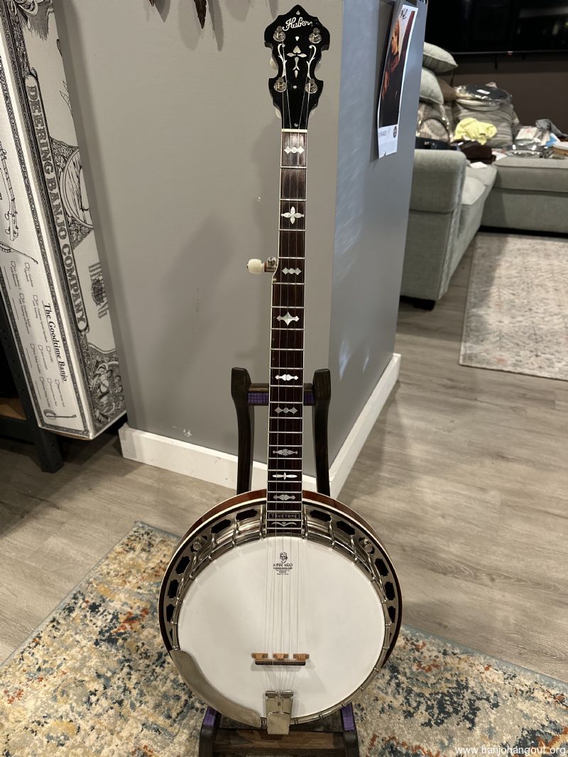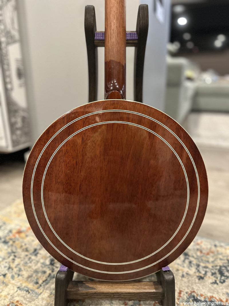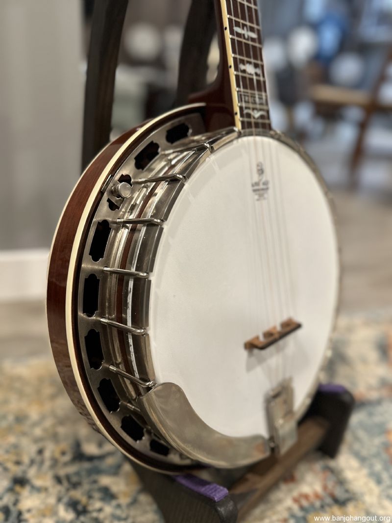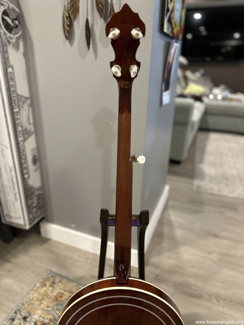 This Huber VRB 3 Banjo was manufactured in Nashville and has the same features if you bought a new one today from Steve: an engineered rim, a Huber HR-30 tone ring, and a mahogany neck and resonator. The Huber VRBs sound closer to a Gibson prewar banjo than anything else on the market today. Huber banjos are on backorder because of a tornado that hit their factory over the summer. Fortunately, they are back in business, but it may be a while before you can get a new Huber VRB 3 from the factory.