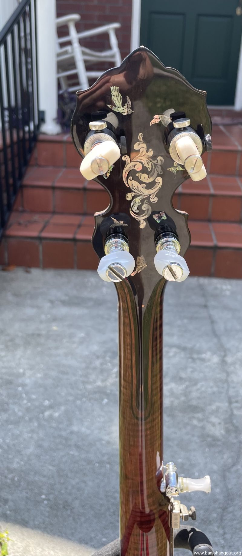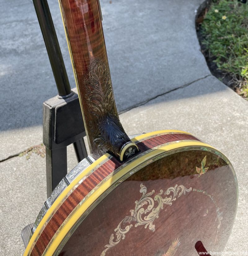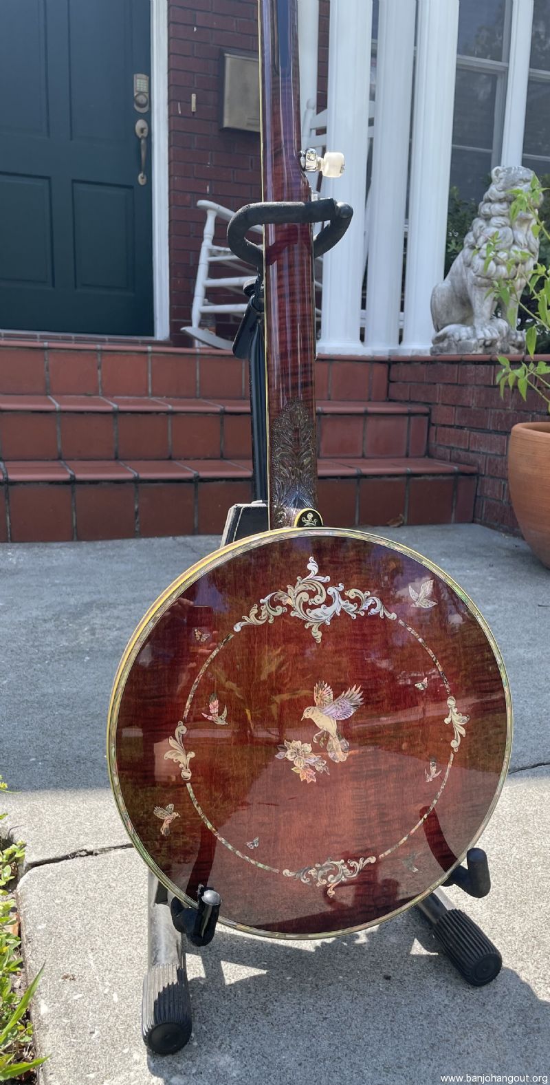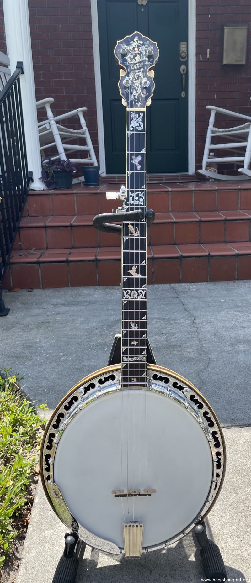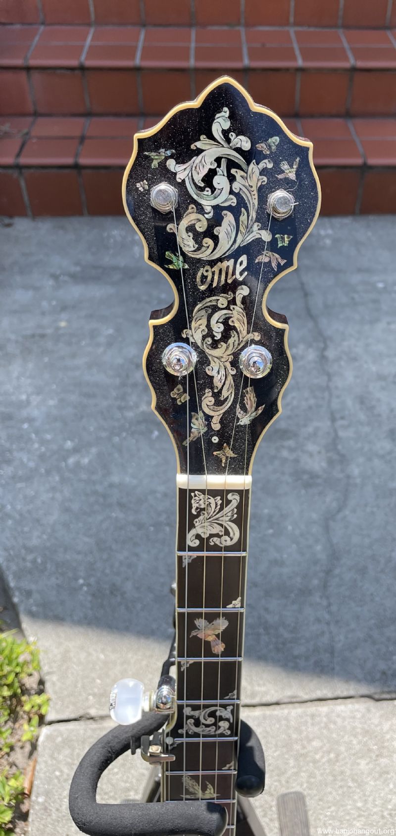 Custom-made 2007 Ome Grand Artist “Spring” Megatone Serial no. 5001 Excellent condition with the deep rich tone for which Ome is famous Curly maple, Deep Sunburst, ebony fingerboard with Abalone, No dye coloring Keith tuners Stainless steel frets Bone nut Bone prewar style fifth string nut Kerschner tailpiece Remo Huber head (2018) Carlton case