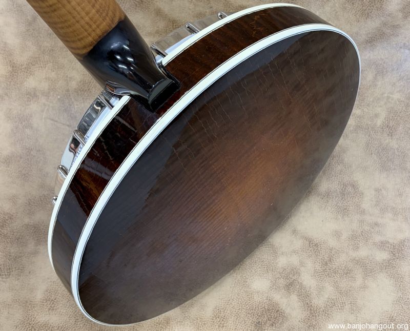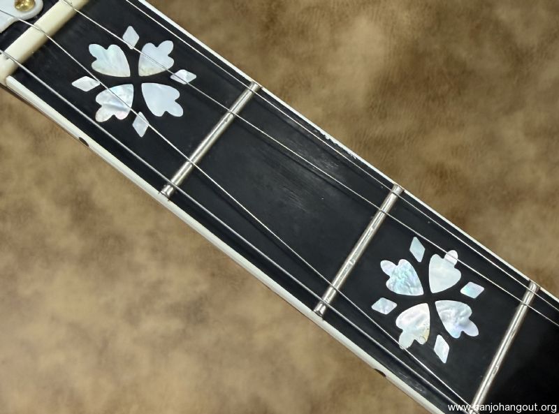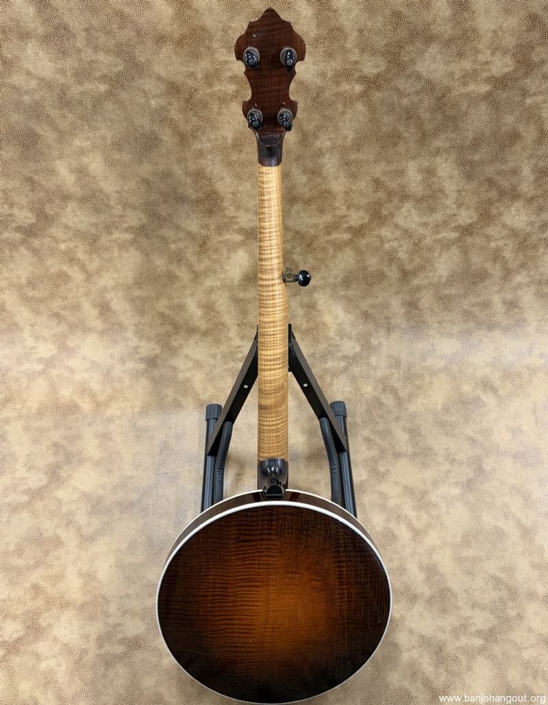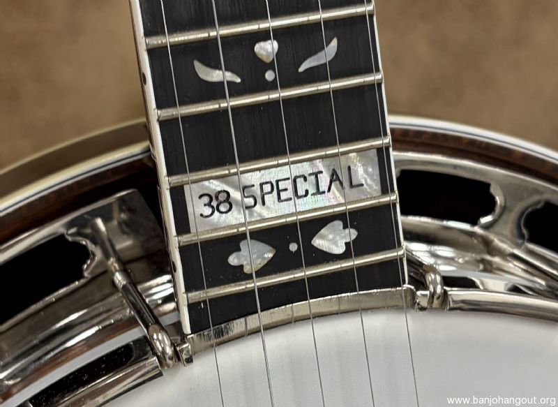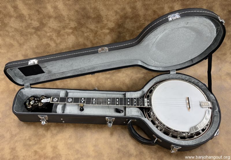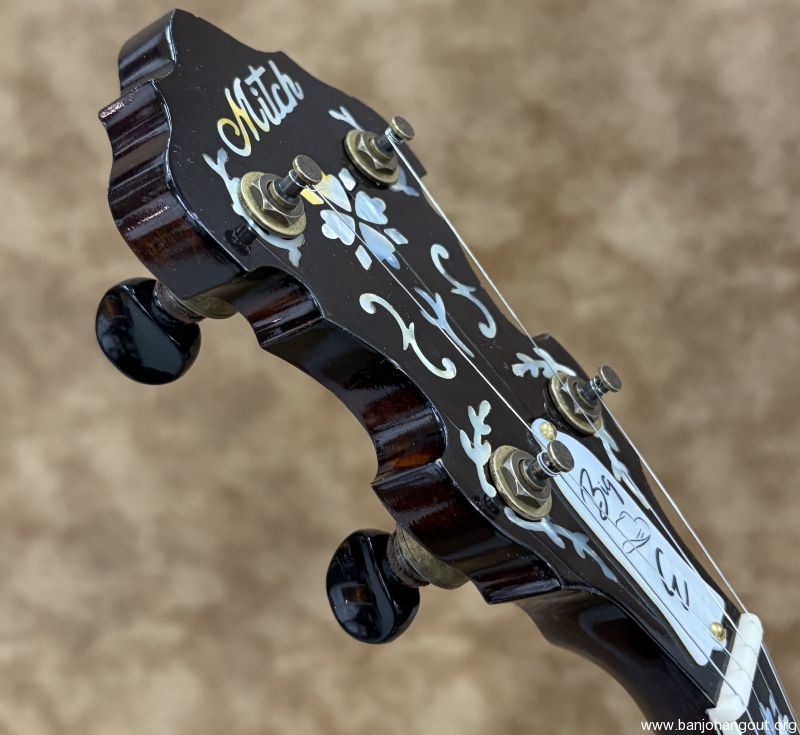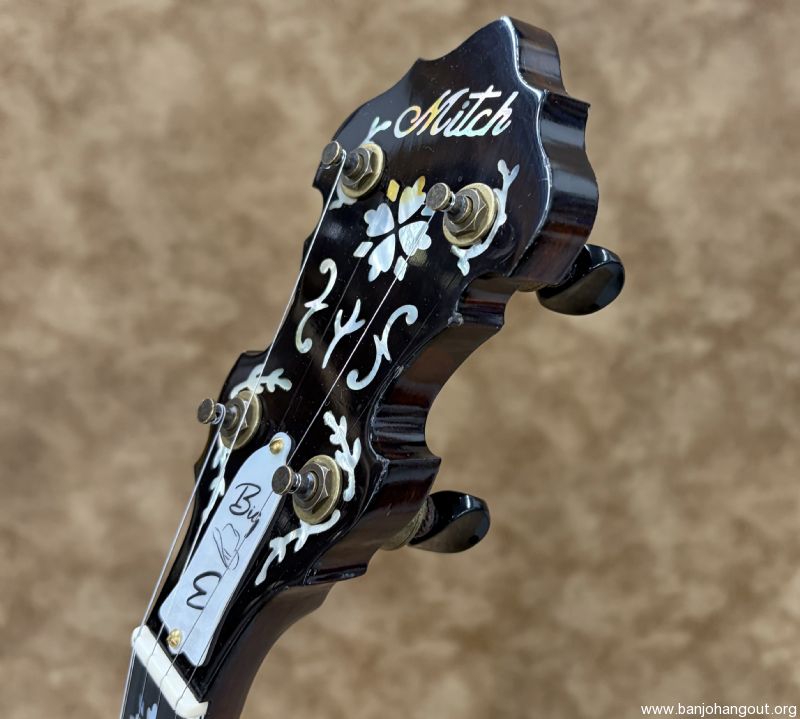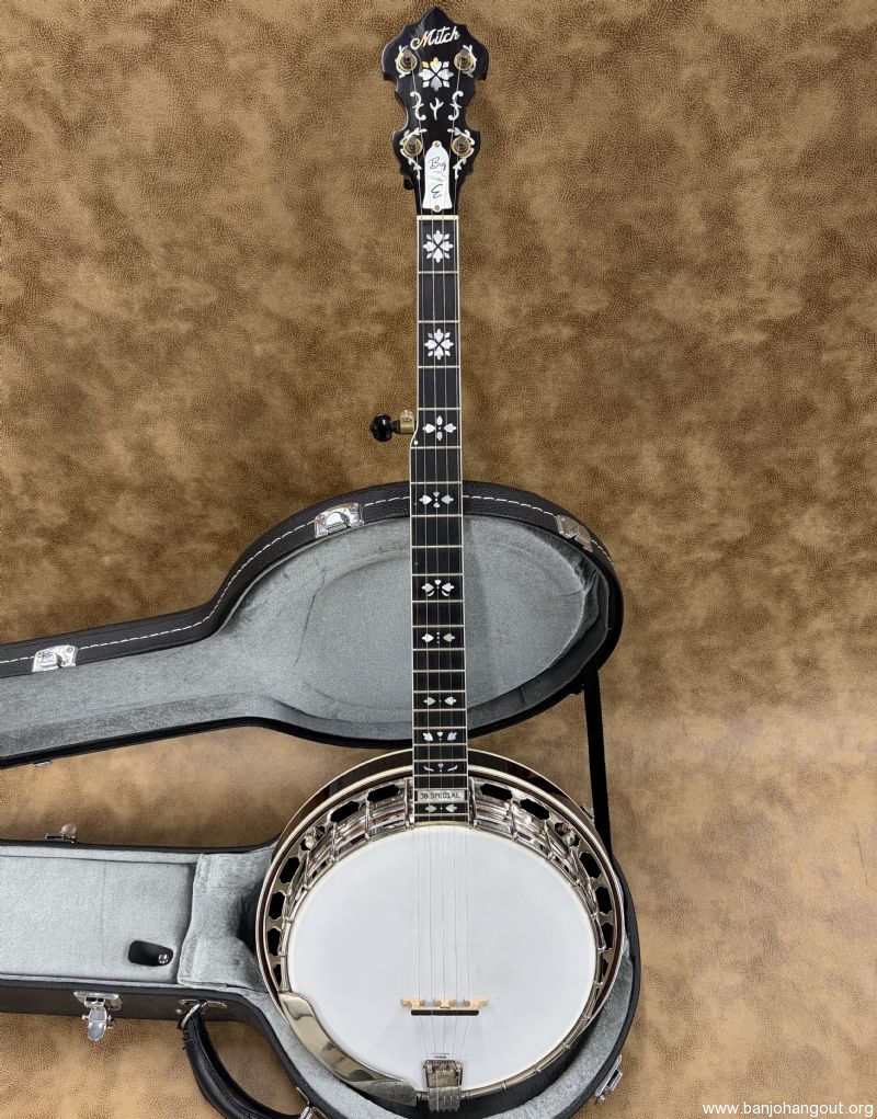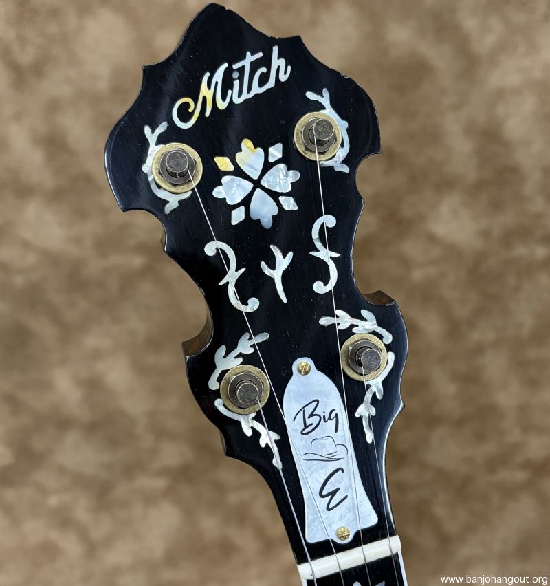 This 2022 "Big E" from Mitch Meadors is a tribute to Earl Scruggs with a curly maple neck and resonator. The neck features the hearts and flowers inlay on an ebony fretboard with a speed neck finish. The reso is a Granada style finish with checking in the finish. At the heart of this banjo is the 38 Special 20-hole flathead tone ring and it sounds great. If you need additional pictures, or have any questions, don't hesitate to ask. Thanks for looking. Here's Video: youtube.com/watch?v=nPVpjVC4m2g
