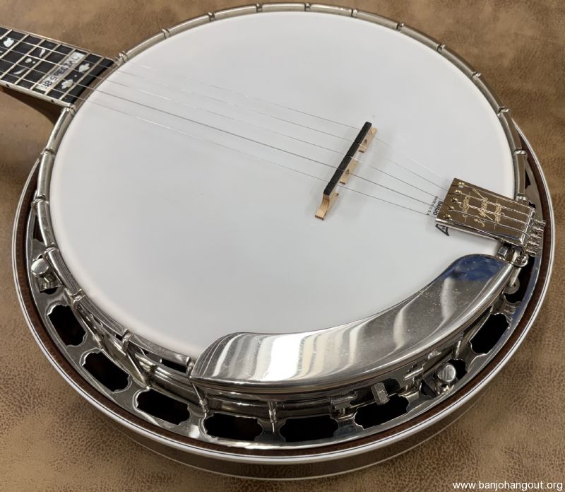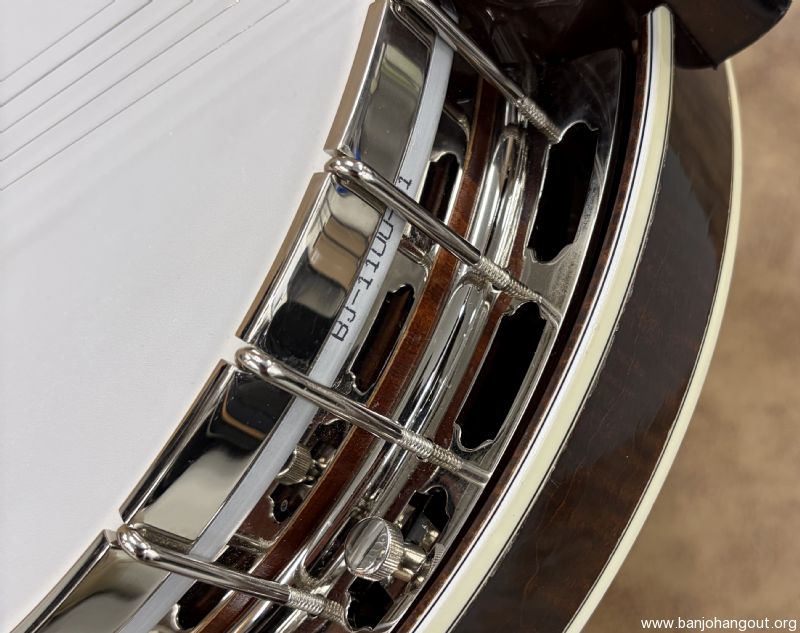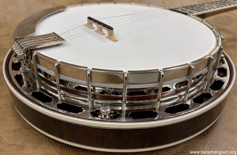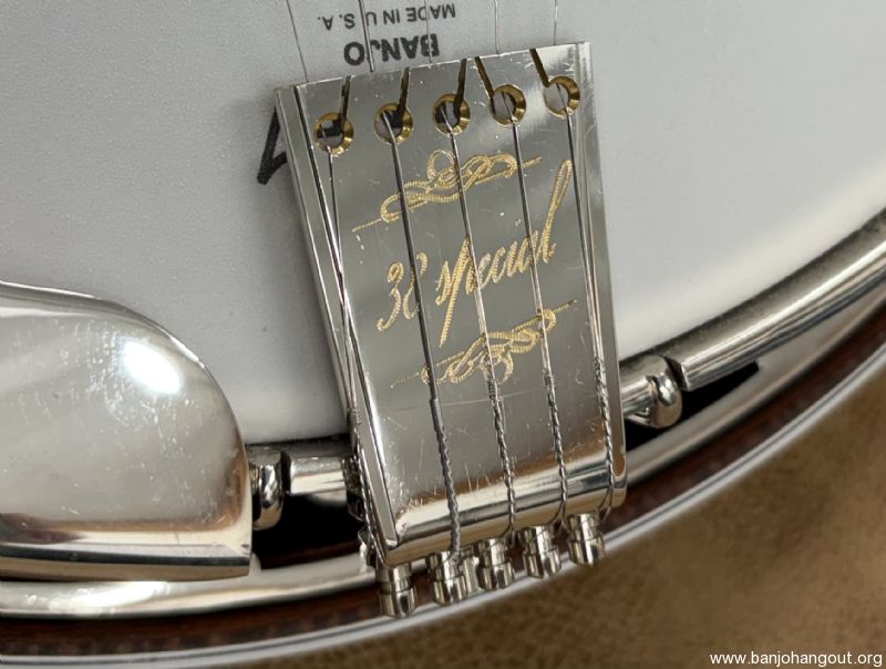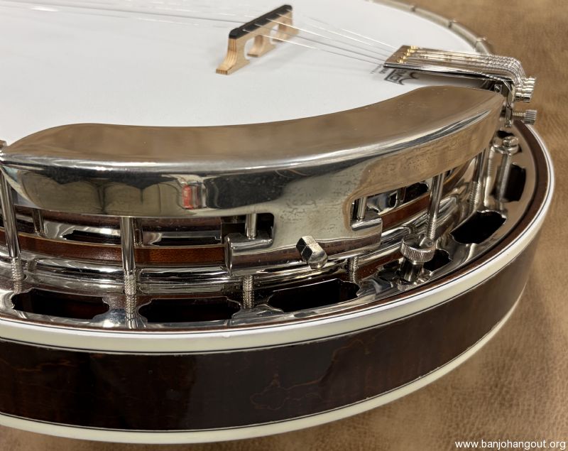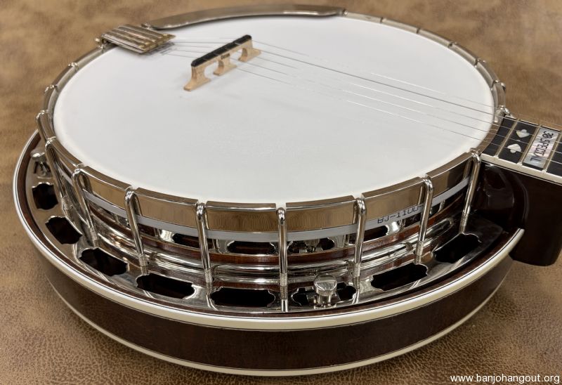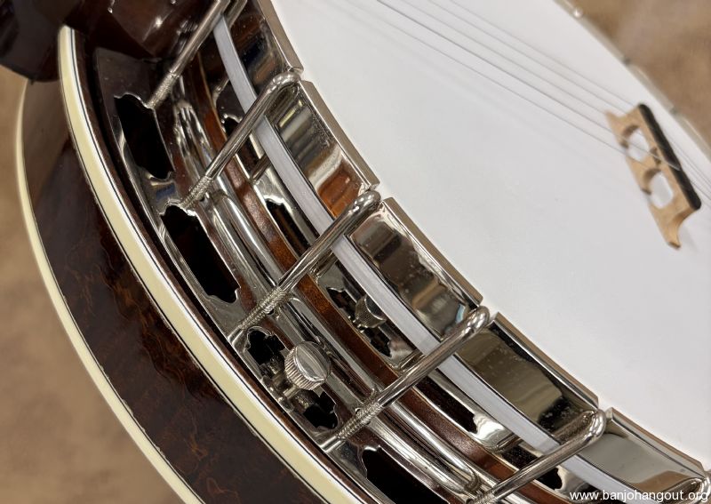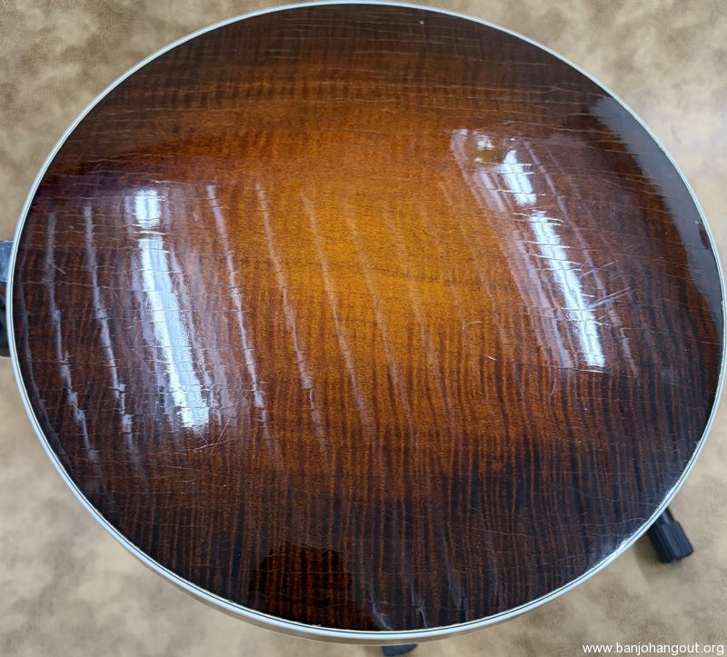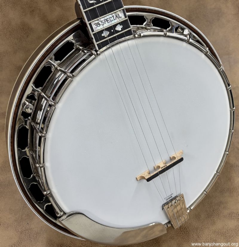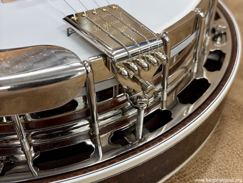 This 2022 "Big E" from Mitch Meadors is a tribute to Earl Scruggs with a curly maple neck and resonator. The neck features the hearts and flowers inlay on an ebony fretboard with a speed neck finish. The reso is a Granada style finish with checking in the finish. At the heart of this banjo is the 38 Special 20-hole flathead tone ring and it sounds great. If you need additional pictures, or have any questions, don't hesitate to ask. Thanks for looking. Here's Video: youtube.com/watch?v=nPVpjVC4m2g