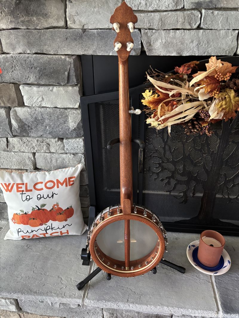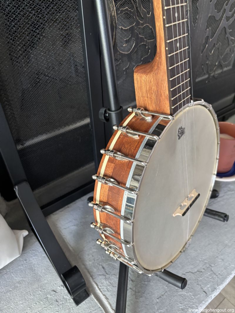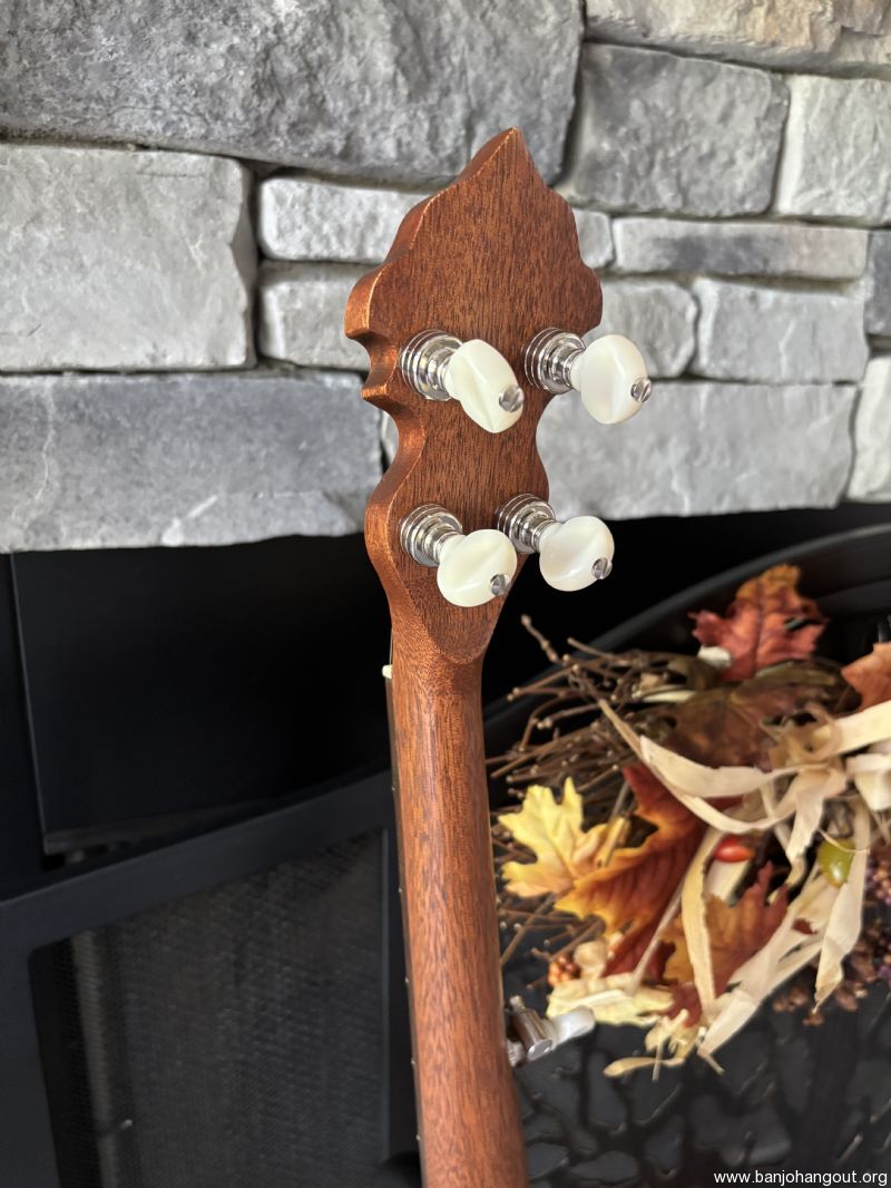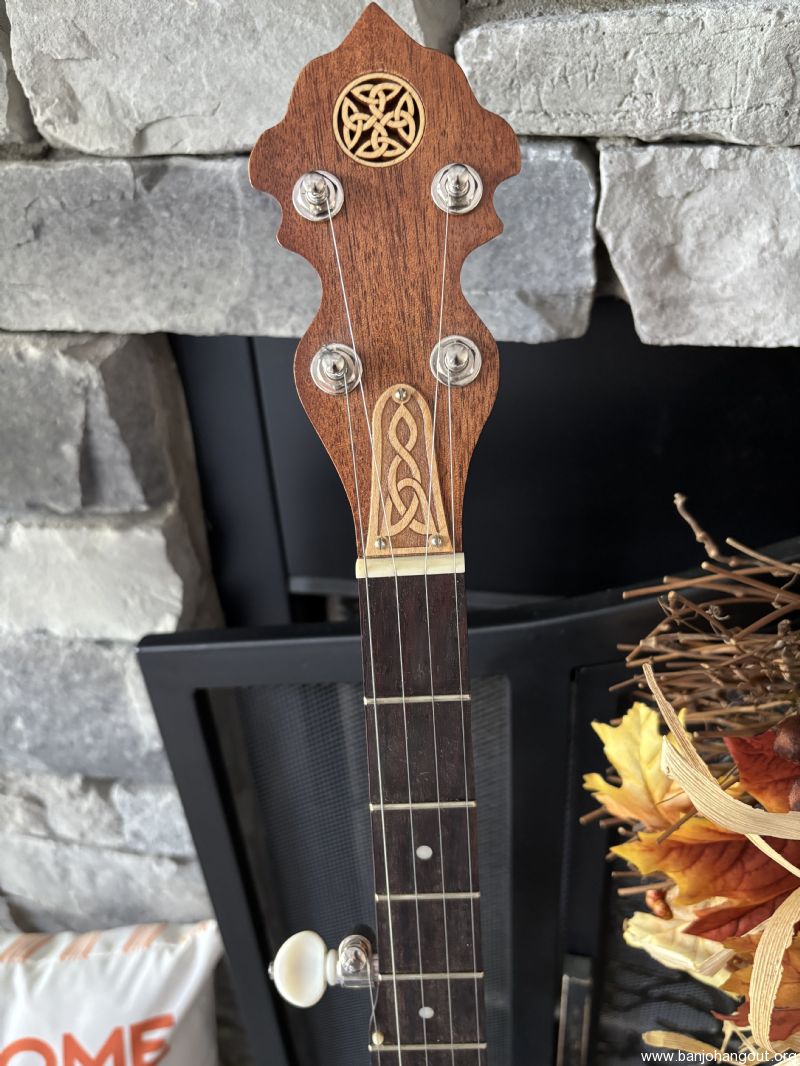 PRICE REDUCED: Solid Mahogany banjo with brass rod tone ring, stack block rim, Gotoh tuners, Celtic inlay in headstock and truss rod cover. Elite banjo head. Updated: 11/2/25