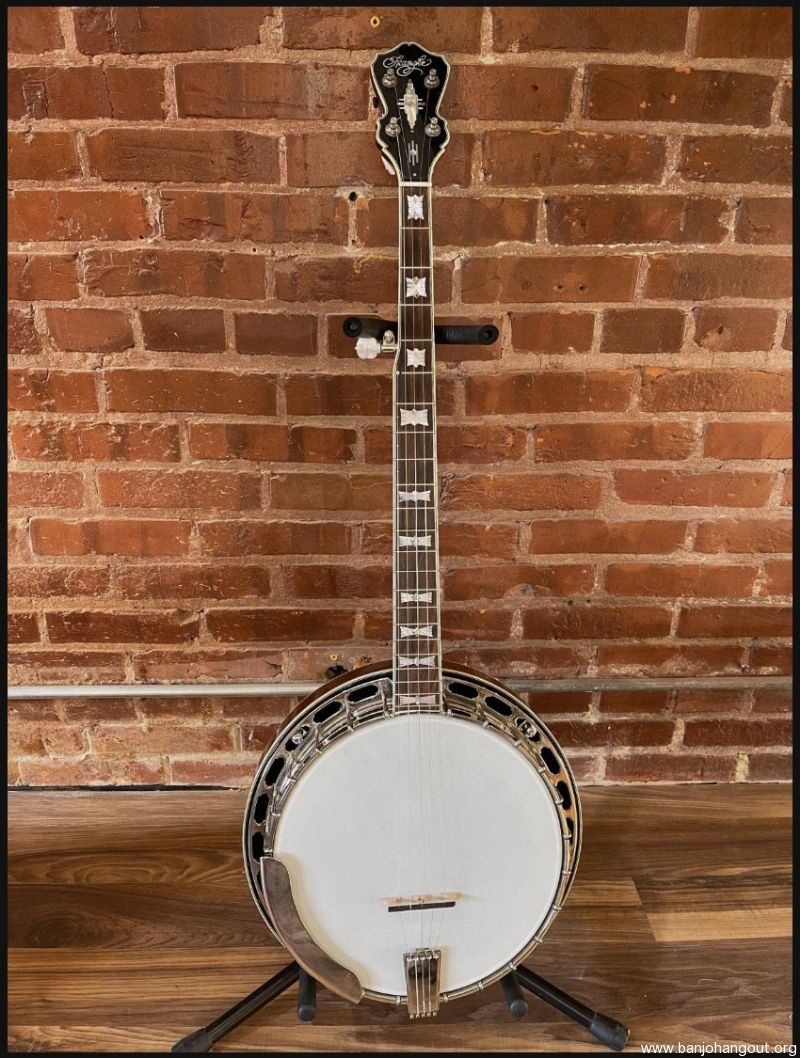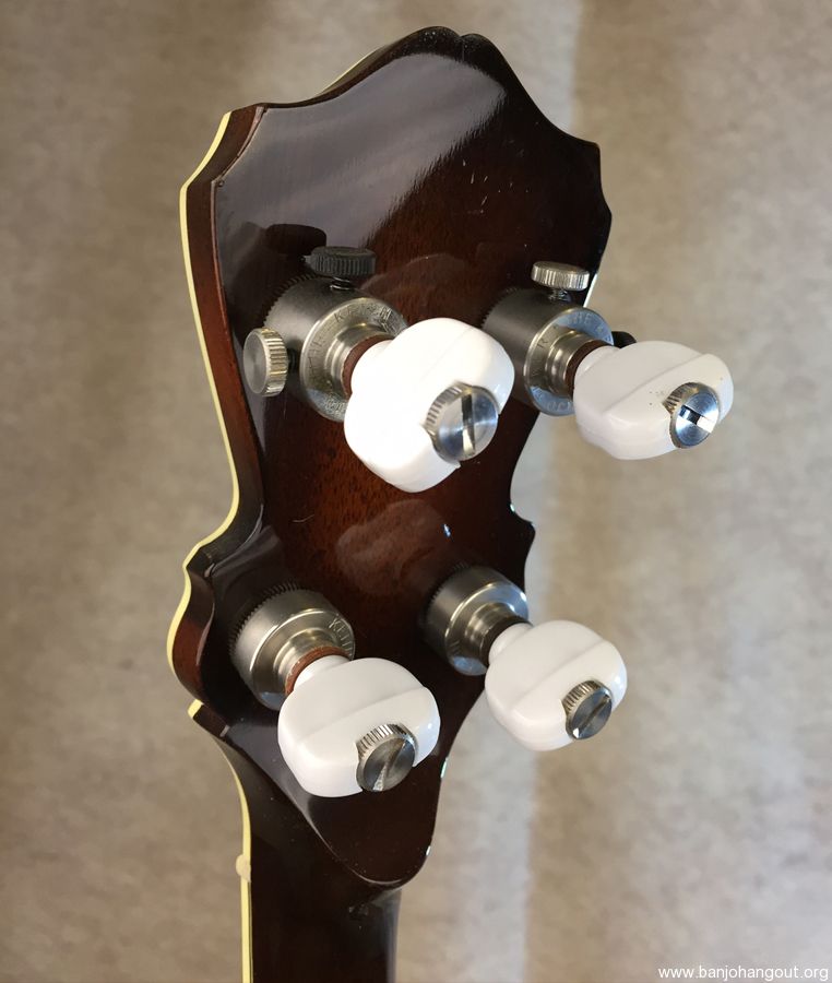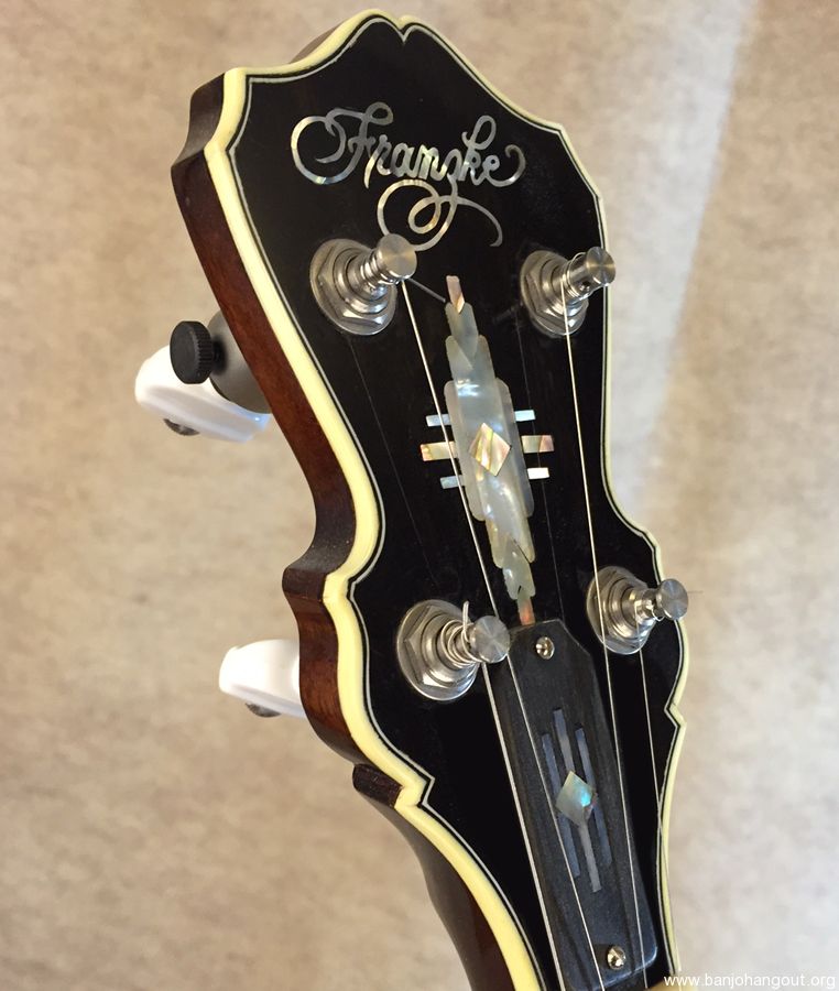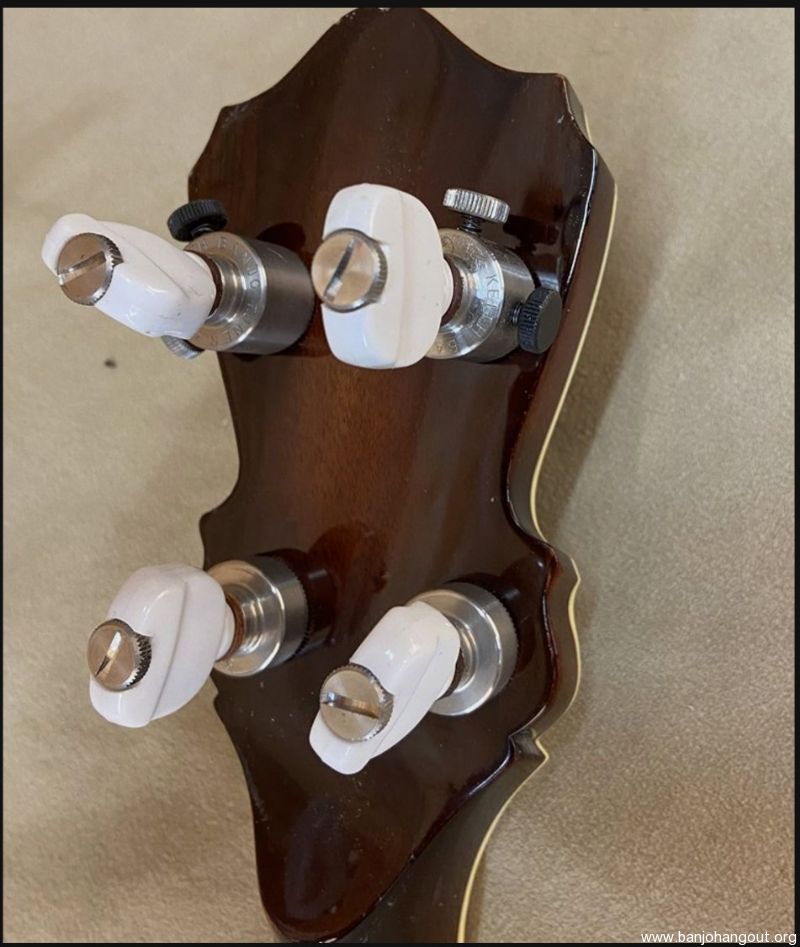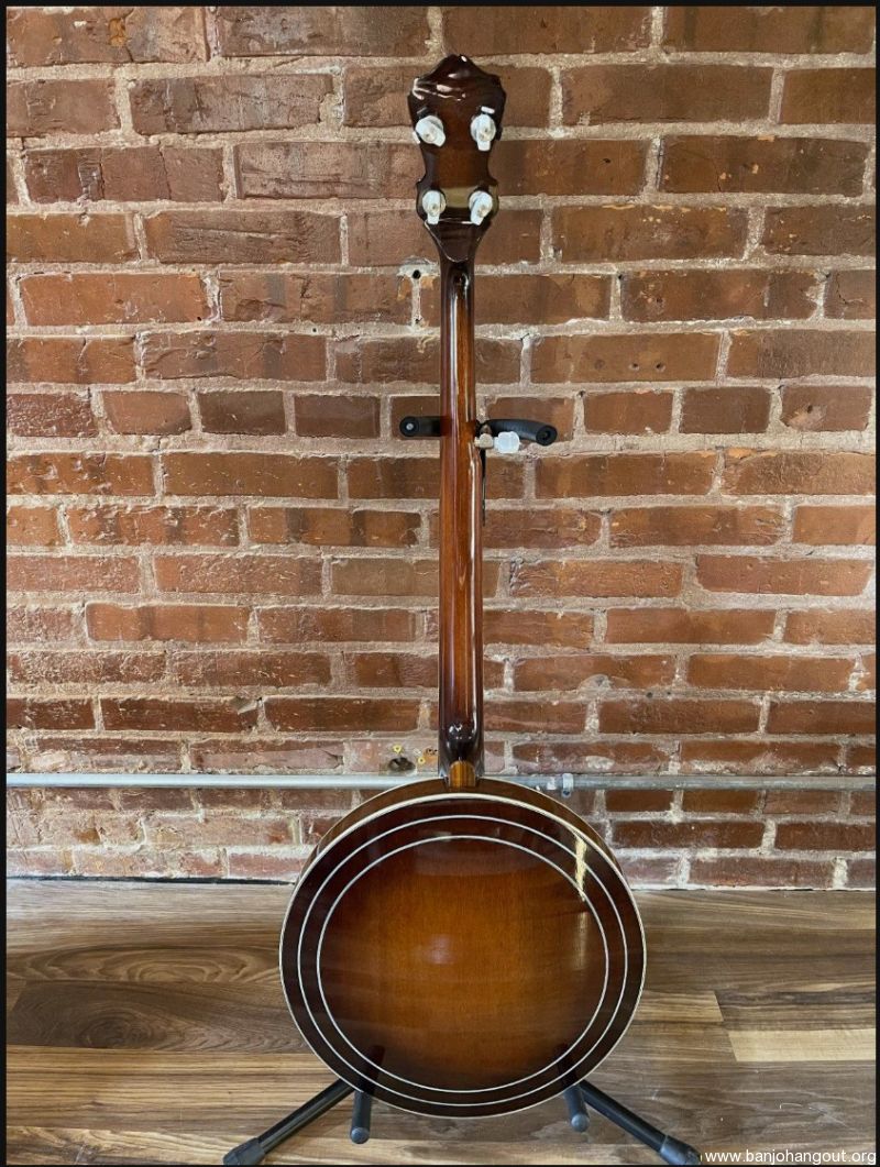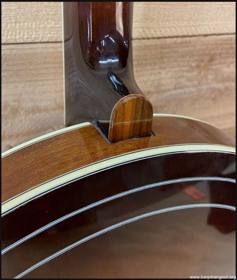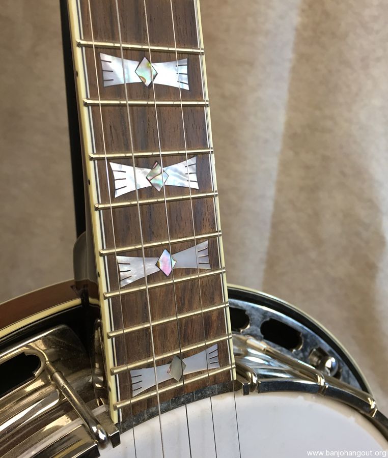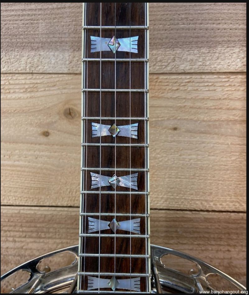I built this banjo for myself in 2013. I loosely based the design on a combination RB-7 and RB-12 just because I liked the Art Deco look of the 30's. Pearl "bowties" with Abalone diamond inlays. All hand-cut inlays. I played it for several years and then decided to change out the pot and offer it up for sale. It now has a Cox Kentucky 5 tone ring and Cox 3-ply maple rim, fit by Adam Cox. Mahogany neck and resonator with multi-line bindings throughout. Keith tuners on all 4, 2 D-tuners on 2 and 3, and standard tuners on 1 and 4. 5-star fifth string tuner. Kershner tailpiece. Built as an art piece, but also to be a top-quality Bluegrass banjo. Crisp and punchy as you would expect from the Cox pot.