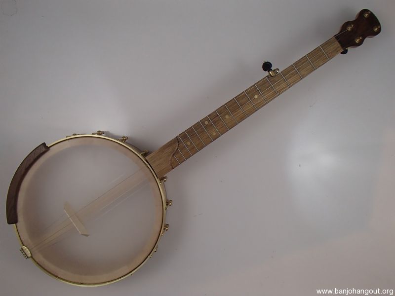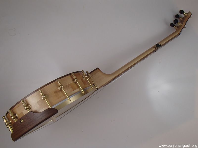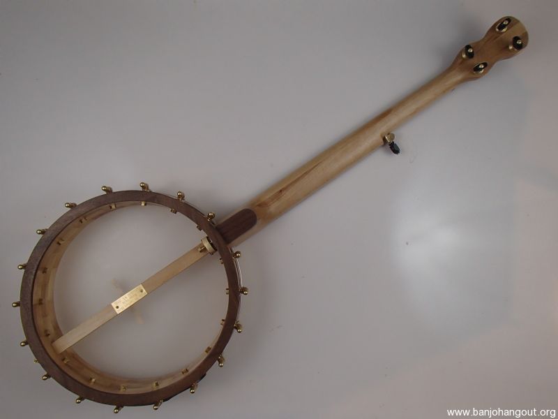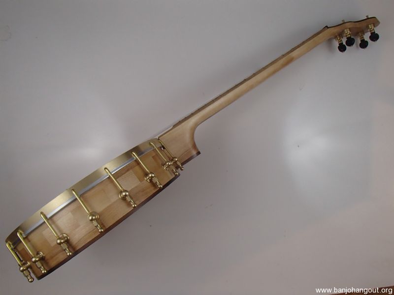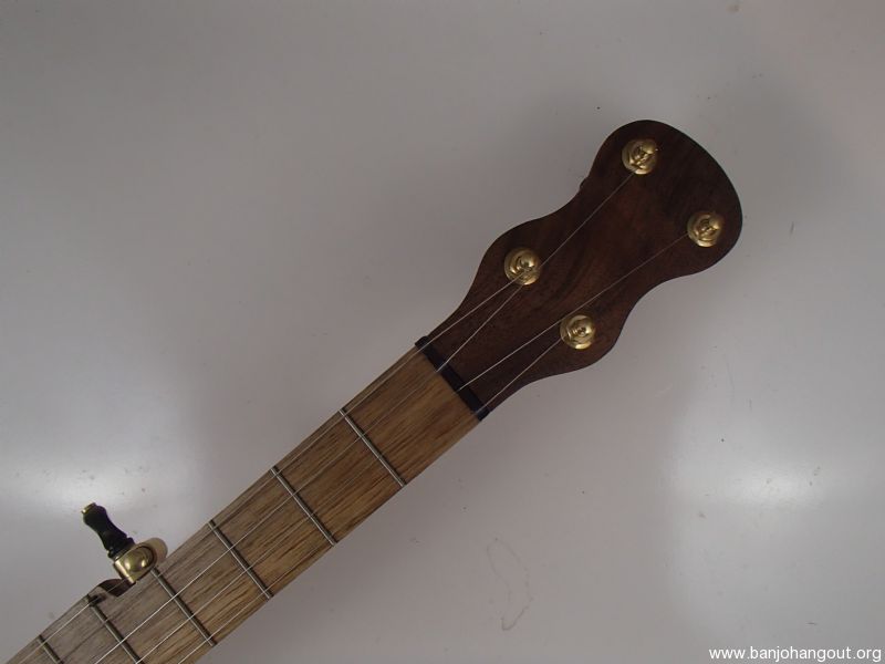 The hardware is raw brass. I will sell the banjo without the armrest for $35 less. The 12" block rim has a wood tone ring profile. The head is a Renaissance, and I can exchange it for a Fiberskyn at no charge. I made the Van Eps style tension hoop, the tone ring, and the dowel stick yoke. The head, tailpiece, strings, and Gotoh tuners came from Smakula Fretted Instruments and the rest of the hardware came from Ode Banjos. The brass plate on the dowel stick has my name, the banjo number, and the town and year of production. There is a two way truss rod in the neck, accessed from the heel. The scale length is 25-1/2", the nut is 1-3/8" wide and made from Corian, and the frets are nickel silver. The 5th string nut is tall, to keep all the strings in the same plane, but I can shorten it so the 5th string rests on the 5th fret if you prefer. I can add 5th string spikes for $5 each. If you want a case I can send the banjo in a Superior CD-1536 or CD-2536 for $175. It is also fine to ship the banjo without a case if you don’t want one. To see a short video demonstration of this banjo please follow the link below: