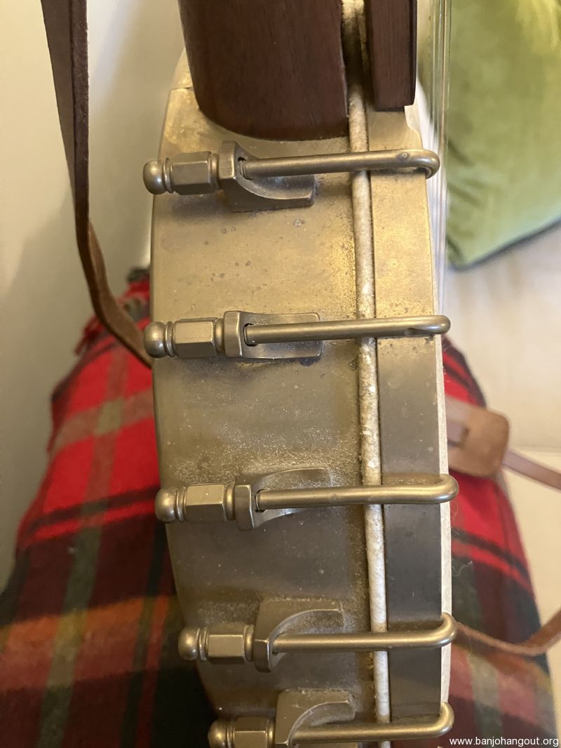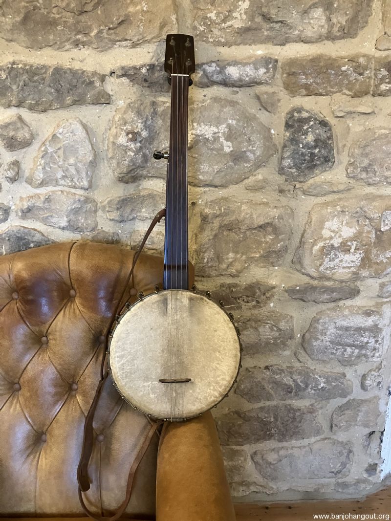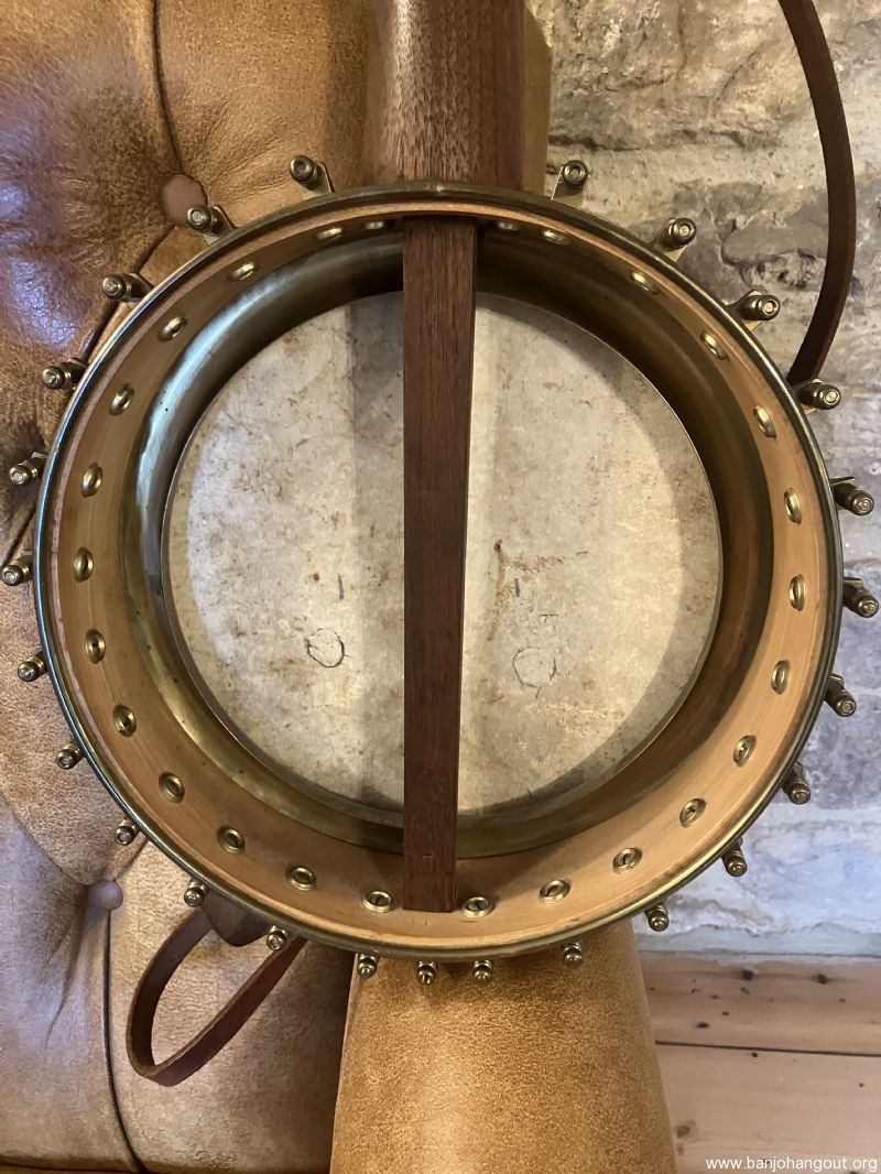 I bought this banjo when the lovely (soon to be considered master banjo maker) Johannes began his journey. The goal was to duplicate a late 19th century Henry Dobson banjo, but to make it with a contemporary player in mind. He used a thin rim encased in brass and a Dobson-style tone ring.