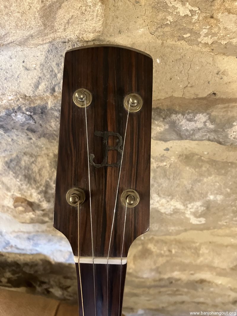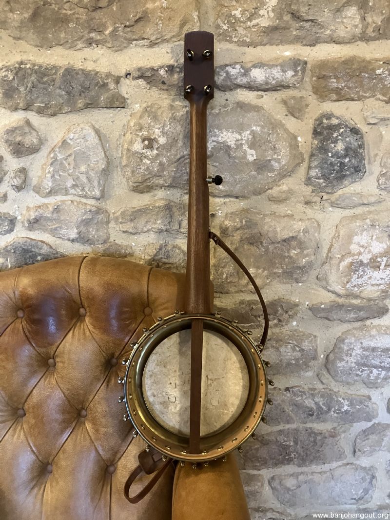 It has an 11.5 inch pot (not exactly sure I’m measuring this correctly?) and a scooped neck. The woods are exceptional and the brass hardware is top quality and completely unique.