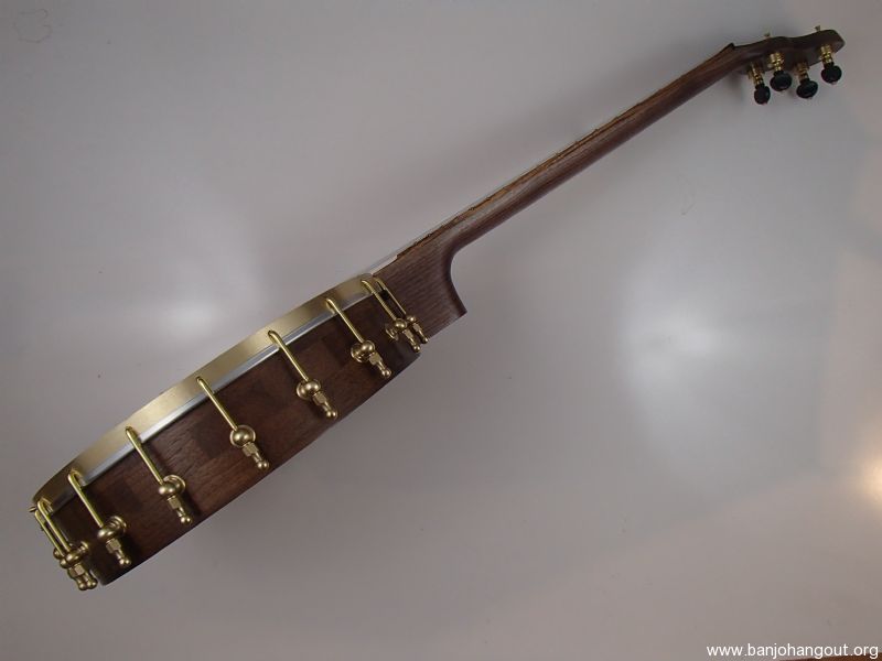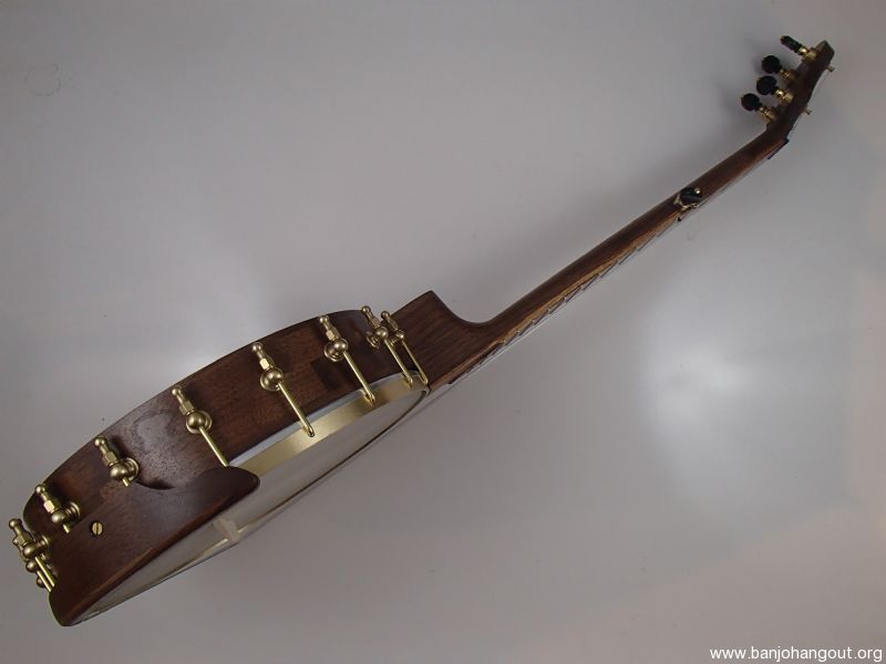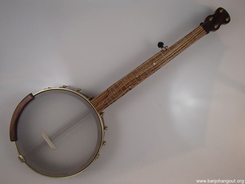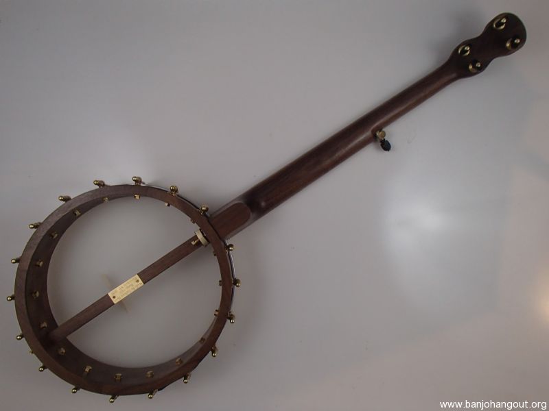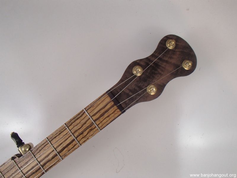 This banjo has a walnut rim, neck and Romero-style armrest, a zebrawood fretboard and raw brass hardware. The wood has a Tru Oil finish. I will sell the banjo without the armrest for $35 less. The 12" block rim has a wood tone ring profile. The head is a Renaissance, and I can exchange it for a Fiberskyn at no charge. I made the Van Eps style tension hoop, the tone ring, and the dowel stick yoke. The head, tailpiece, strings, and Gotoh tuners came from Smakula Fretted Instruments and the rest of the hardware came from Ode Banjos. The brass plate on the dowel stick has my name, the banjo number, and the town and year of production. There is a two way truss rod in the neck, accessed from the heel. The scale length is 25-1/2", the nut is 1-3/8" wide and made from Corian, and the frets are nickel silver. The 5th string nut is tall, to keep all the strings in the same plane, but I can shorten it so the 5th string rests on the 5th fret if you prefer. I can add 5th string spikes for $5 each. If you want a case I can send the banjo in a Superior CD-1536 or CD-2536 for $175. It is also fine to ship the banjo without a case if you don’t want one. To see a short video demonstration of this banjo please follow the link below: