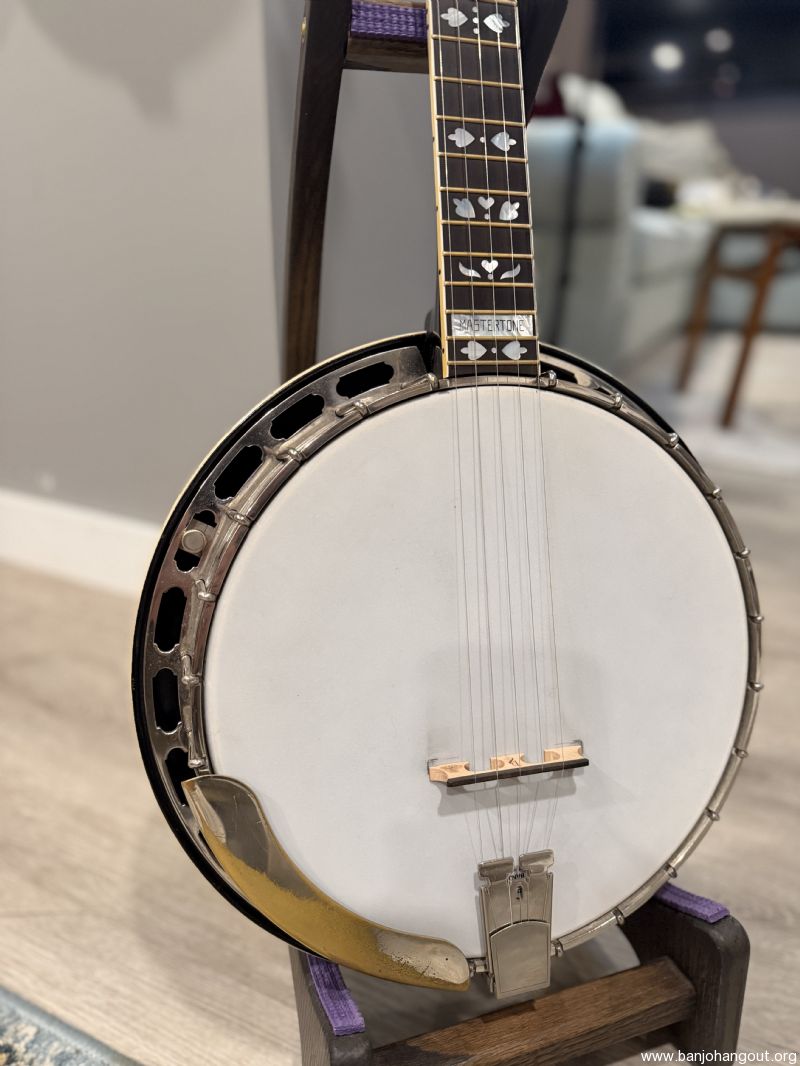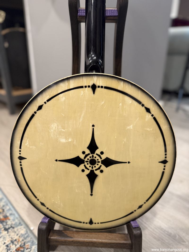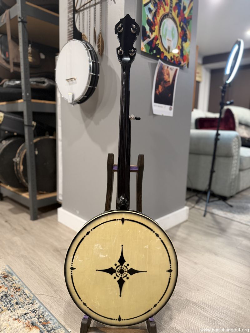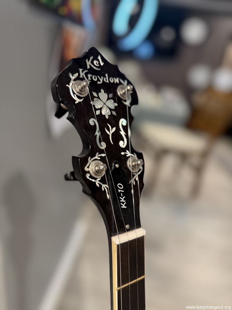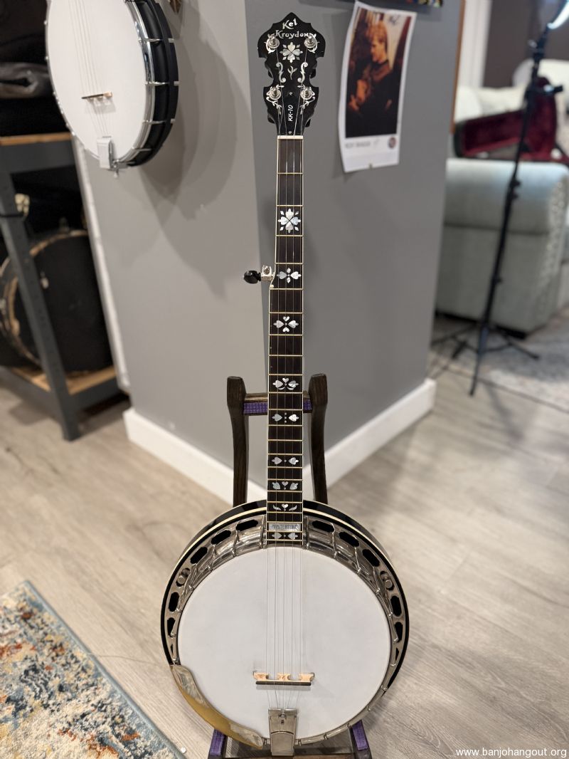 1930s Prewar Gibson / Kel Kroydon Style 10 banjo with wonderful neck made by David Houchens featuring EVO frets on an ebony fingerboard! This wonderfully feeling neck was stained (not painted) black to match the style 10 banjos rim and resonator! Gotoh Tuners with black tuning buttons make this instrument a real "head turner". It plays and sounds like a dream outfitted with a Huber Vintage Tone Ring. Fresh setup!