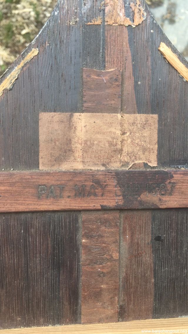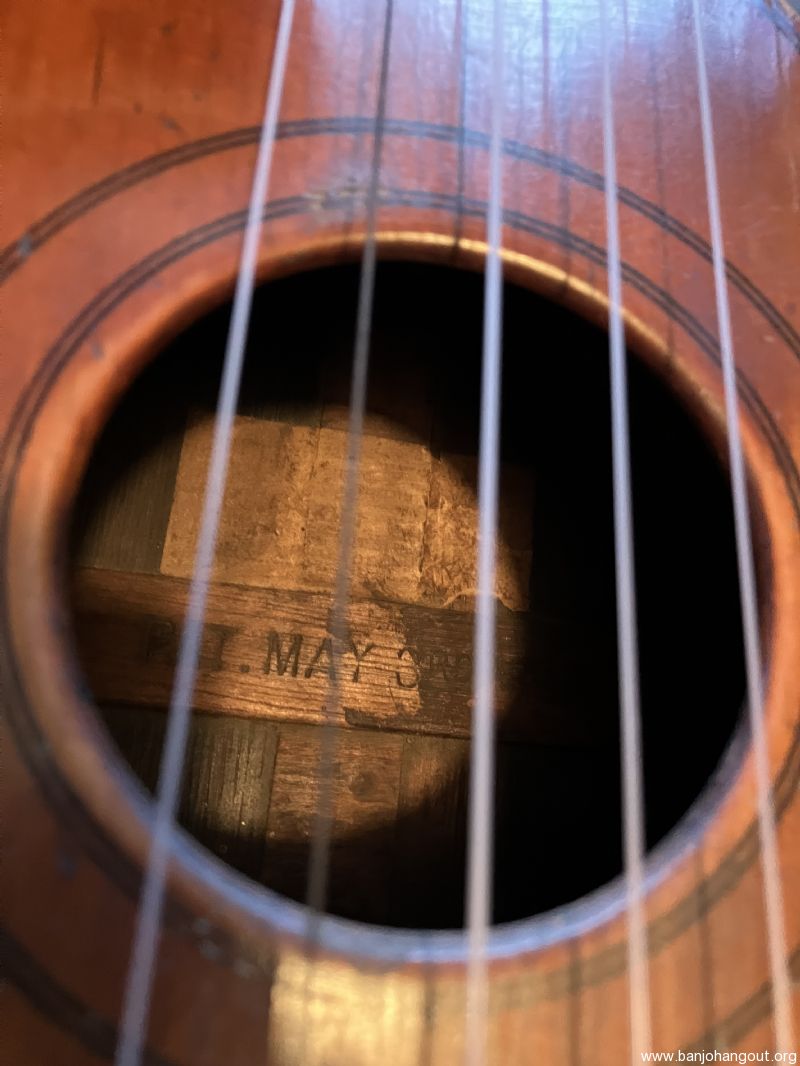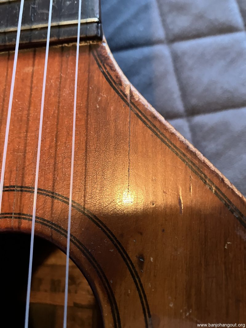 I got this in trade several years ago and fixed it up. This instrument retains a tag (see last photo) from one F.H. Griffith of Philadelphia, Pa, a music and instrument dealer at the time, positioned right above the top back brace with the typical “Pat. May 3rd 1887” branding. While a plainer model, that is made up for by being the rosewood version, with bookmatched back (with striking sapwood inclusion) and sides (the fingerboard, dyed some, also appears to be rosewood). Typically, Pollmanns were made with either mahogany or rosewood back and sides, and on the rare chance with figured maple. I’ve commonly seen mahogany models, but rosewood examples not as often. The spruce top and mahogany neck finishes are original and untouched. To repair some of the cracks it had in the back and sides, I ended up sanding and refinishing it (unfortunately, it was colder weather at the time and the finish I used went on a bit heavier than I meant for it, and it cratered some on the sides). Some of the original finish’s crackling can still be seen in spots where I didn’t completely remove it. The fingerboard does have some divots in the first couple of frets, and there is some fret wear as well. The frets appear to be original. The middle back brace appears to be a replacement done sometime ago (it looked to have been worked on at one time long before I got it, along with a clear repair for the crack that ran along the treble side 3/4s of its length, which I repaired and touched up). There is a few hairline cracks on the back, though stable and for the most part cleated. There is one on the top which I’m pretty sure I also cleated. There is minor seam separation of the top on either side of the sound hole, but nothing serious nor affecting anything.