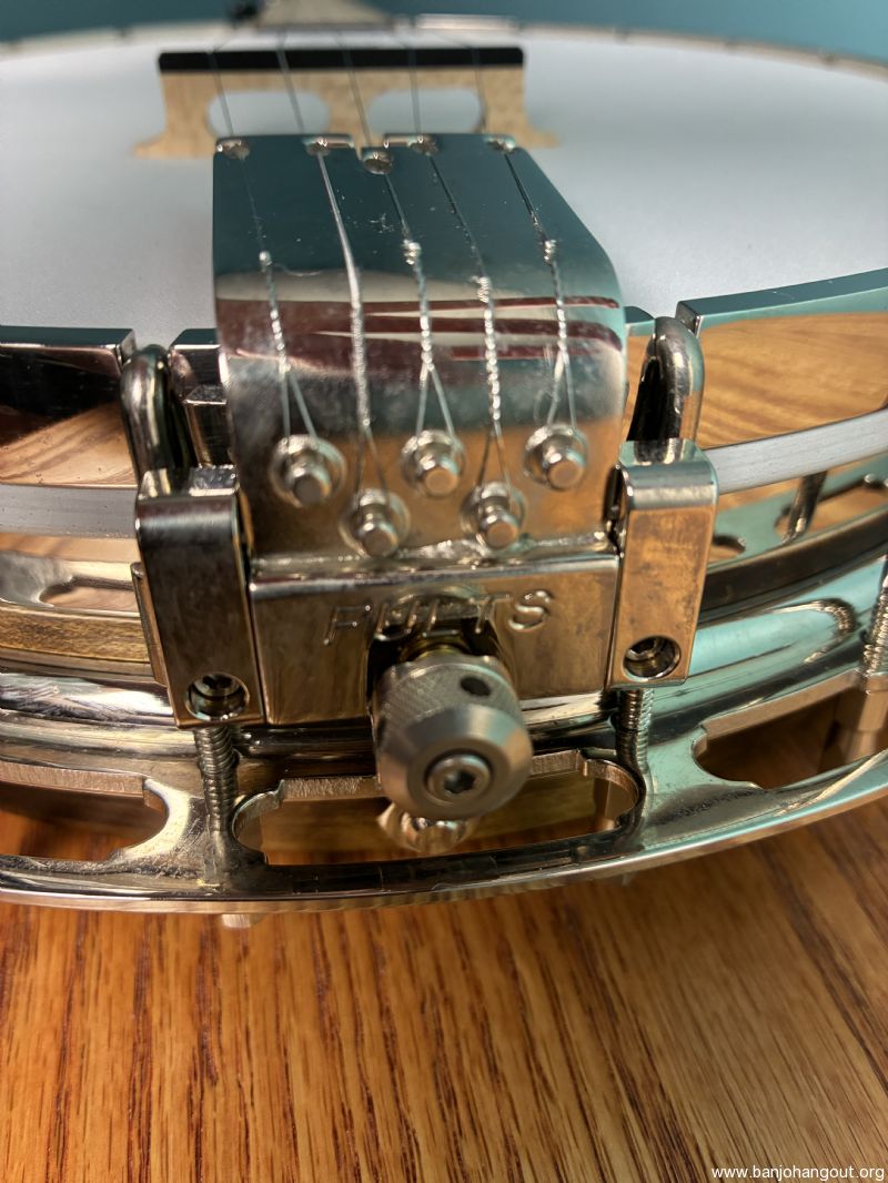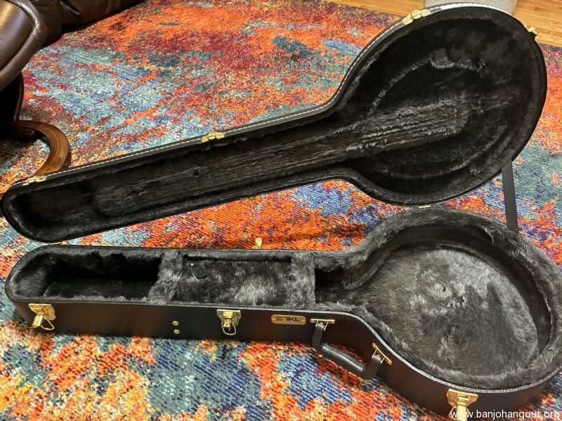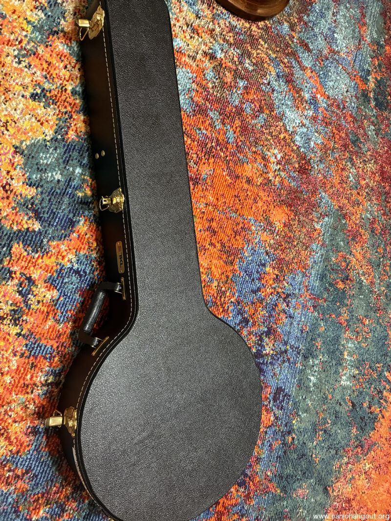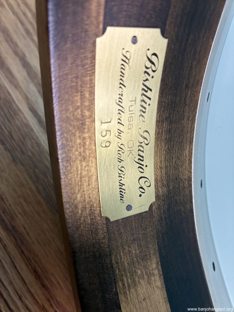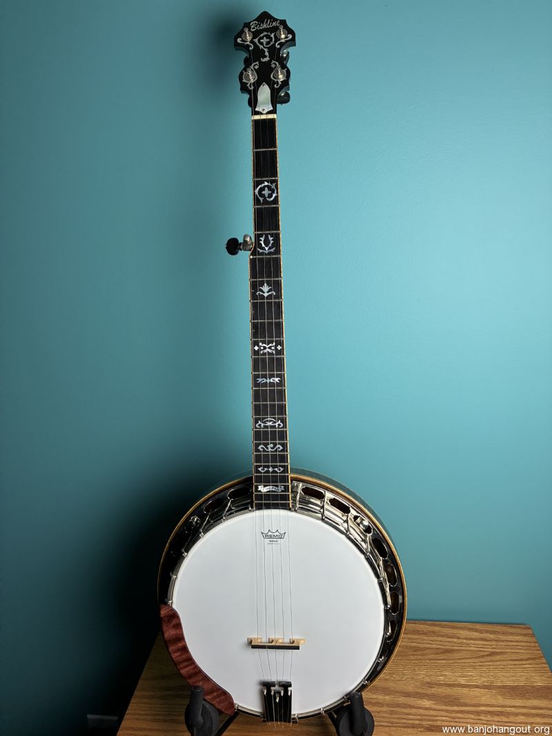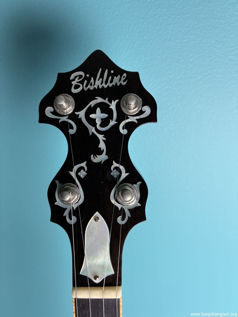 Beautiful Bishline Custom with traditional wreath inlay. Banjo features a block style rim, full weight tone ring, adjustable Fults tailpiece, curly maple binding, and a Deering Smile 5/8” bridge (not pictured). Great sound, easy playability, and in excellent condition. Quality TKL case included. Banjo has no issues or known repairs. Small ding on fretboard between frets 16&17. Metal parts are clean and bright.