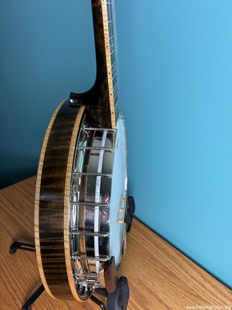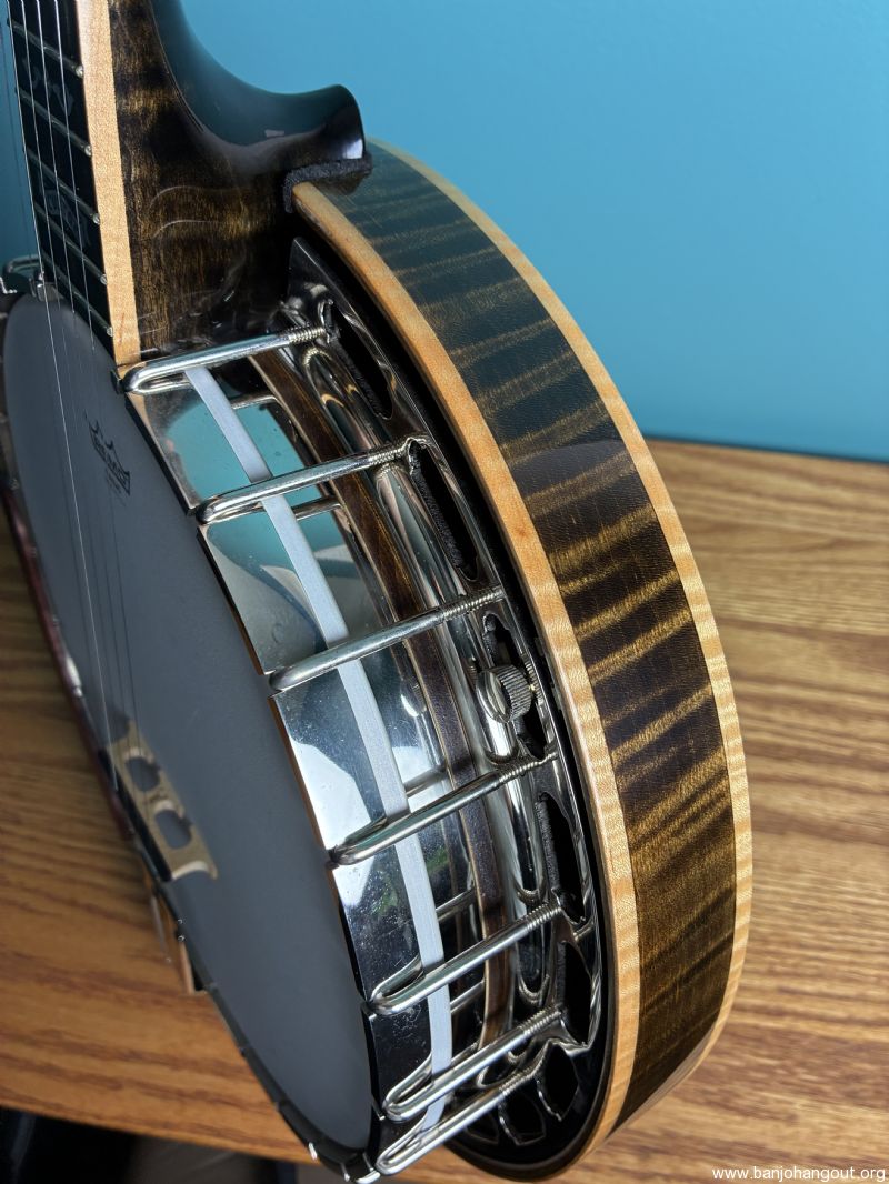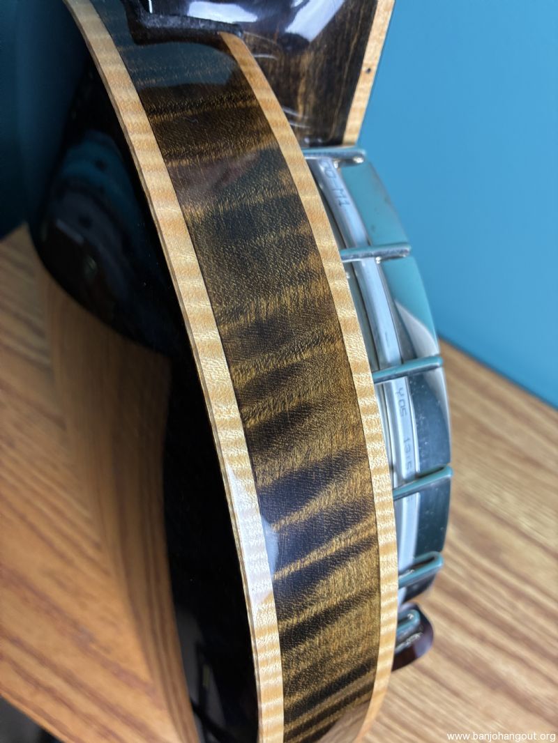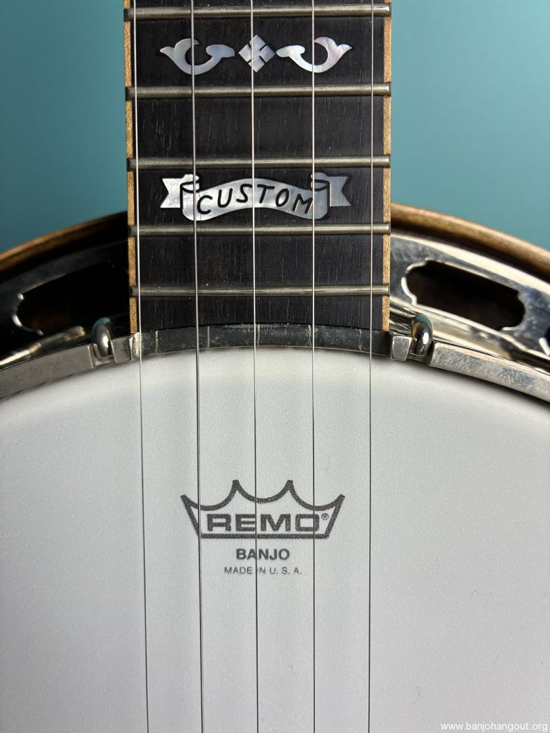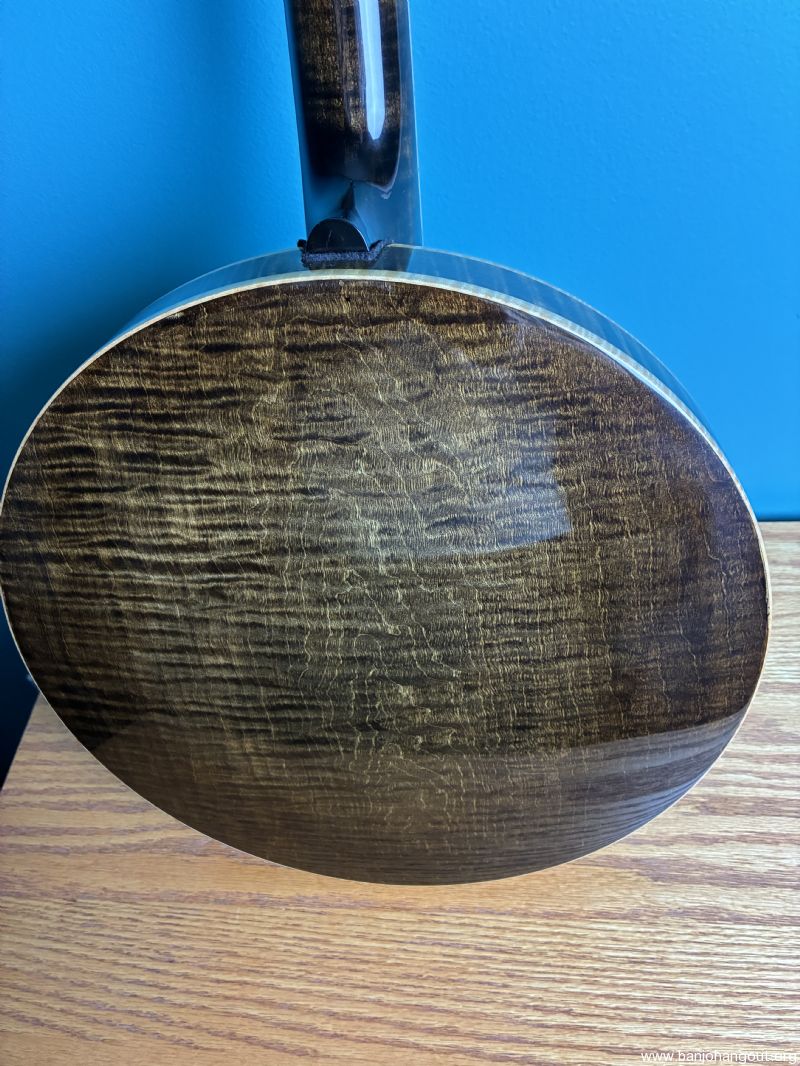 Beautiful Bishline Custom with traditional wreath inlay. Banjo features a block style rim, full weight tone ring, adjustable Fults tailpiece, curly maple binding, and a Deering Smile 5/8” bridge (not pictured). Great sound, easy playability, and in excellent condition. Quality TKL case included. Banjo has no issues or known repairs. Small ding on fretboard between frets 16&17. Metal parts are clean and bright.