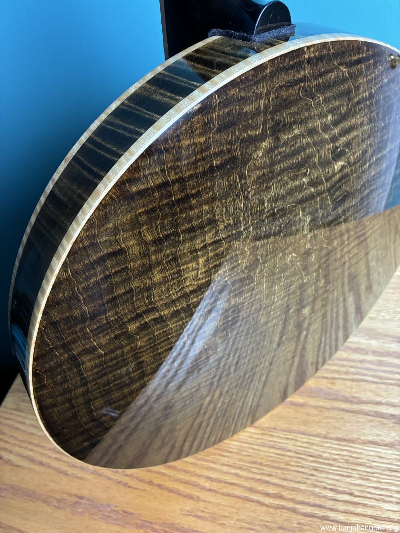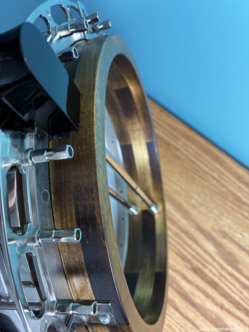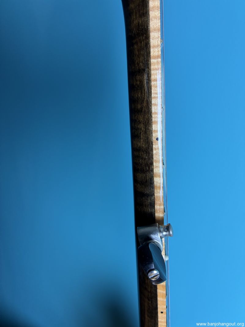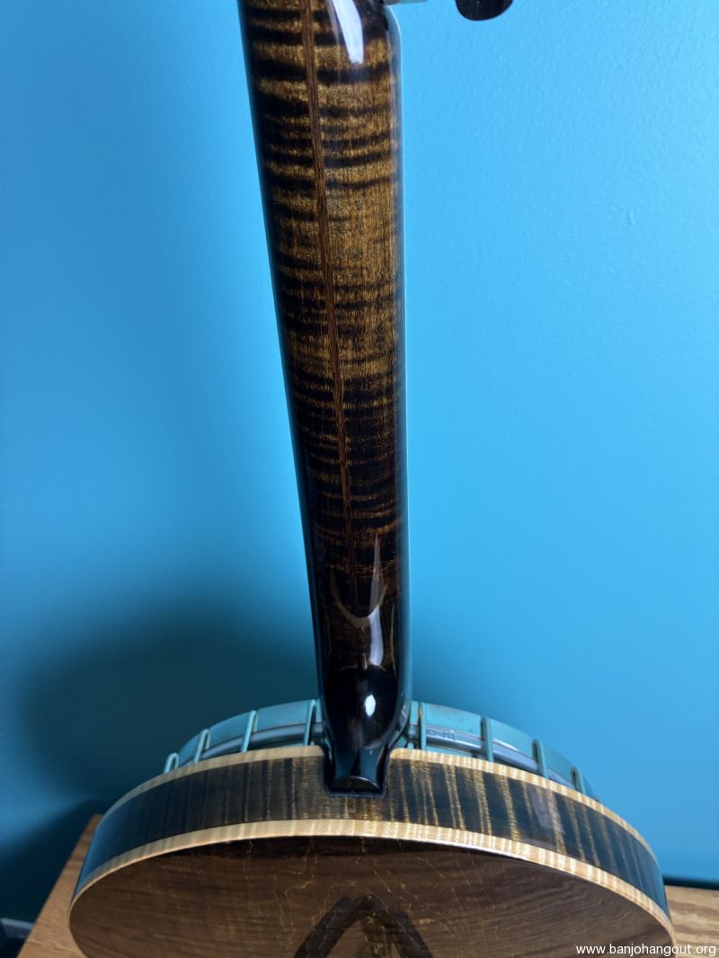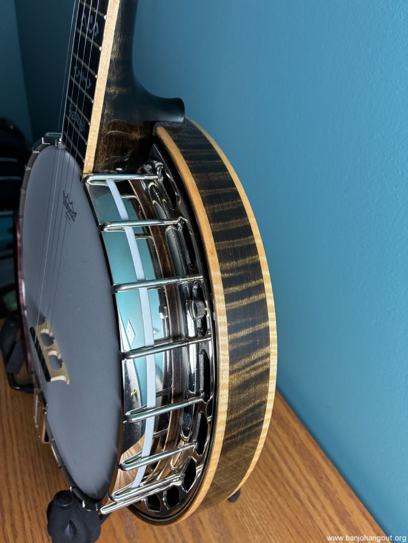 Beautiful Bishline Custom with traditional wreath inlay. Banjo features a block style rim, full weight tone ring, adjustable Fults tailpiece, curly maple binding, and a Deering Smile 5/8” bridge (not pictured). Great sound, easy playability, and in excellent condition. Quality TKL case included. Banjo has no issues or known repairs. Small ding on fretboard between frets 16&17. Metal parts are clean and bright.